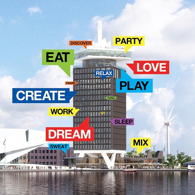 過去阿姆斯特丹人所熟悉的地標大樓「對角塔樓 Toren Overhoeks」(因以45度角的姿態促立於河岸邊而得名),現在有了個新名字「A' DAM」,取自「A」msterdam 「 D」ance 「A」nd 「M」usic的縮寫。「A' DAM」是一棟名符其實的 Party Hall ,原塔樓建築誕生於七零年代,是由建築師 Arthur Staal 為荷蘭皇家石油公司 Shell 所設計的辦公大樓,直到 2009 年 Shell 搬離此塔歷經短暫的閒置,2012 年由開發商 Lingotto 與幾家重量級合作廠商/未來承租業者:連續十四年被選為世界最佳夜店之一的 Club AIR ,舉辦 Trance Energy、Mystery Land 、Sensation 等大型電音活動的始祖 ID&T,國際音樂代理商 MassiveMusic,共同進行改建規劃,計畫在 2016 年以「音樂創意垂直城市」的全新面貌,讓這棟阿姆斯特丹的地標繼續搖擺下去。