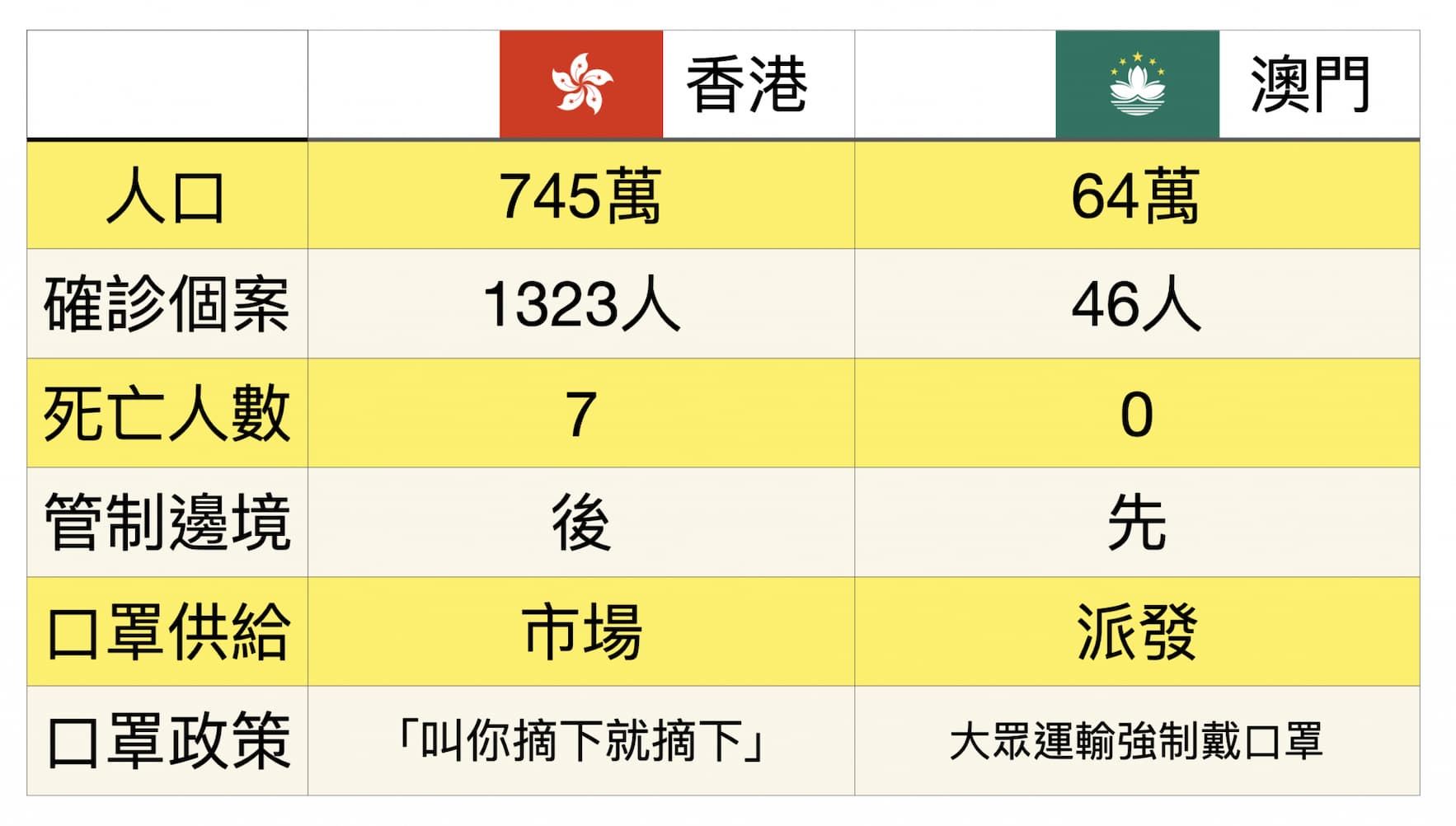 客觀而言,澳門的人口僅 68 萬,遠少於香港的 750 萬,對口罩的需求天壤之別。再者,澳門經濟單一,賭場停止運作,有助於民眾留在家中工作,亦使居住在珠海的市民無需跨境上班,減少跨境人流與市面人群聚集。澳門地少人稀,社會風氣簡單淳樸,政治參與意識低落,政黨單一操控局勢,問題遠比香港少,因此,澳門政府能夠速戰速決地解決問題。此外,澳門近年來積極發展大數據分析與應用,透過「臉部辨識」系統紀錄出入境的旅客,亦同時記載旅客的啟程地,掌握已入境遊客在澳具體位置,形成大數據資料庫。在這次防疫行動上,賀一誠表現掌聲如雷,林鄭月娥則噓聲四起,主要是因為不少澳門人把賀政府與前任政府作比較,超強颱風重創澳門,「天鴿」吹襲記憶猶新,政府失職責無旁貸。香港在經歷「非典」後理應吸引教訓,然而卻被上任不到兩個月的賀一誠「一朝翻盤」,港府的後知後覺,防疫措施不如澳門,完全「忘記沙士的痛苦經歷」(按:沙士=SARS),外界普遍認為澳門的防疫工作比香港成功。新冠肺炎再度加深「反送中」抗議運動的不滿情緒,激化「中港」矛盾與衝突蔓延,港府處事優柔寡斷、拖泥帶水,導致民怨日增、無法宣洩,民望盡失的林鄭月娥急忙「拍馬屁」,為求討好中國,堅決維護「一國」政策而失去「兩制」的靈活。