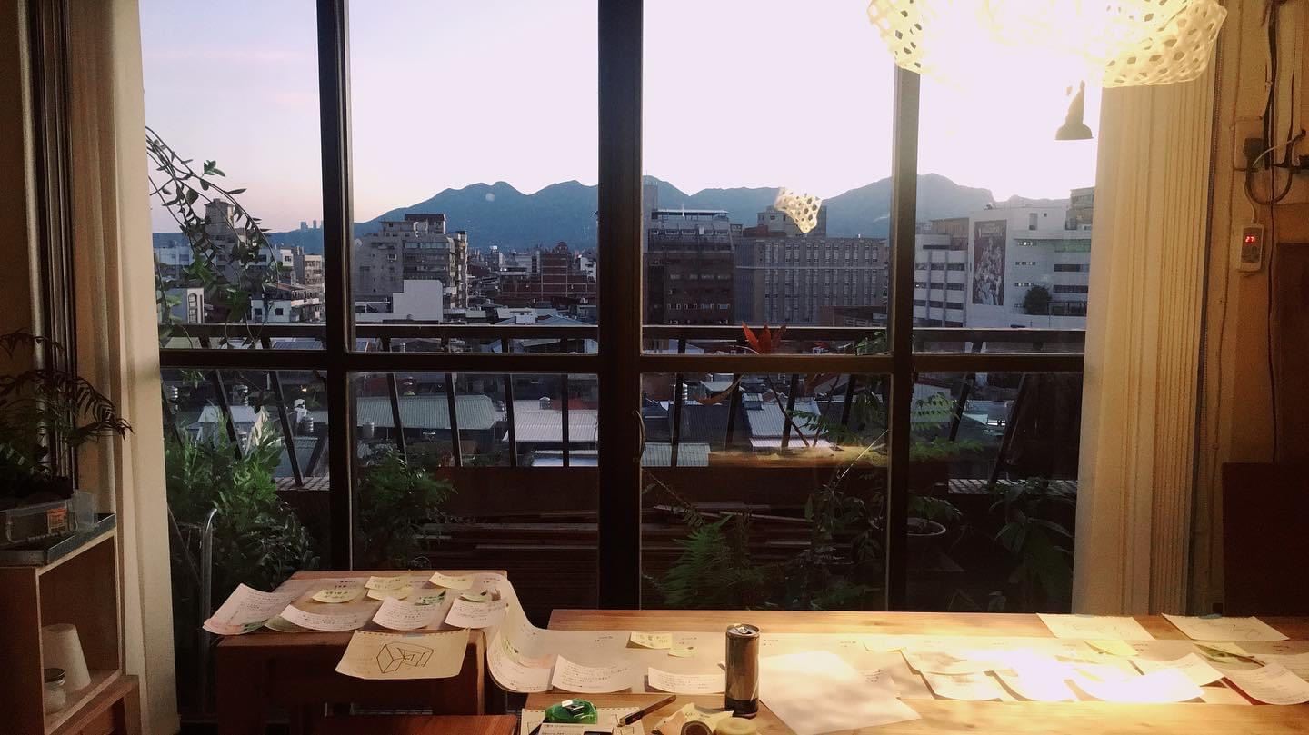 共同工作室所在位置為一棟11層電梯大樓的10樓,進入室內便會看到一組大工作桌,這裡是黃遠君與夥伴們平時開會與工作的空間,而這次參與徵文活動的陽台就緊鄰著大桌,不只引入室外的自然光,一轉身走到陽台,就能俯瞰大稻埕街區的人文風景,並將遠方開闊的大屯山景收入眼簾。從馬不停蹄的工作中停頓下來,需要喘息的時候,共同工作室的夥伴們便會來到陽台,觀察氣象萬千的天光雲影、遠山上的景觀建築以及鄰里巷弄間的人間煙火,陽台於是成為大家休息放鬆的重要場所。