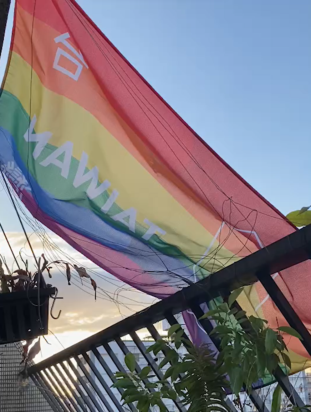 除了植栽佈置,工作室的陽台也變為議題發聲的「窗口」,藉由這樣的空間向外倡議相關理念。例如先前同性婚姻合法化的討論正發酵時,黃遠君就將象徵多元性別的彩虹旗開展在陽台,除了響應議題瀰漫時的社會氛圍,也成為向街坊鄰里訴說理念的平台,讓意見於此落地寧靜發聲,「陽台」這處介於公私之間的中介空間,因而被詮釋出一套獨特的空間使用方法,別具意義。