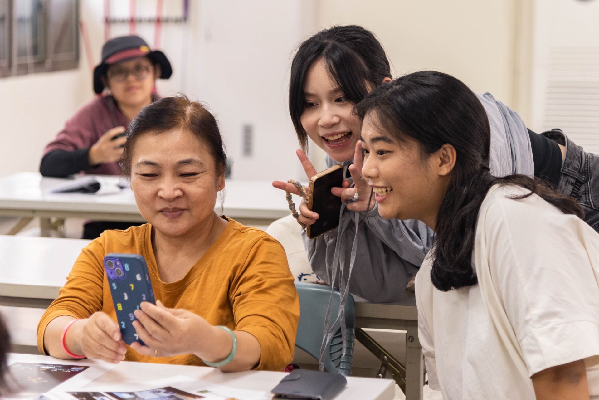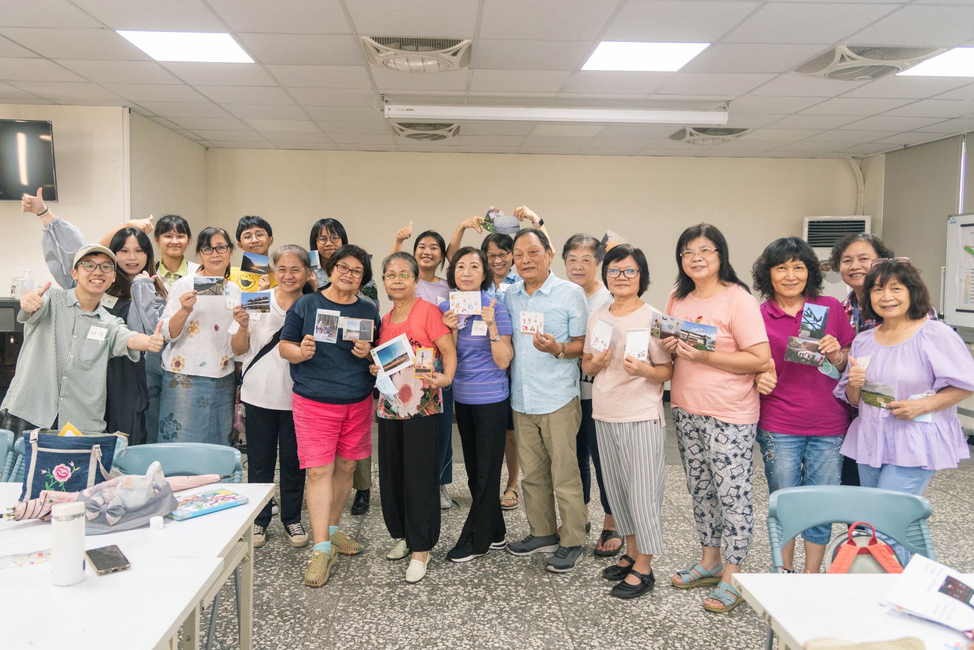 在行動育成計畫的實驗行動階段,團隊採納居民的想望,設計出「島語工作坊」系列的第一場活動「嶼你一起,映像記憶——手機使用暨明信片工作坊」,通過在地里長、美學會會長,以及地方社群的核心人物——坤天亭會計阿姨的宣傳,吸引許多在地社群的長輩前來共襄盛許。