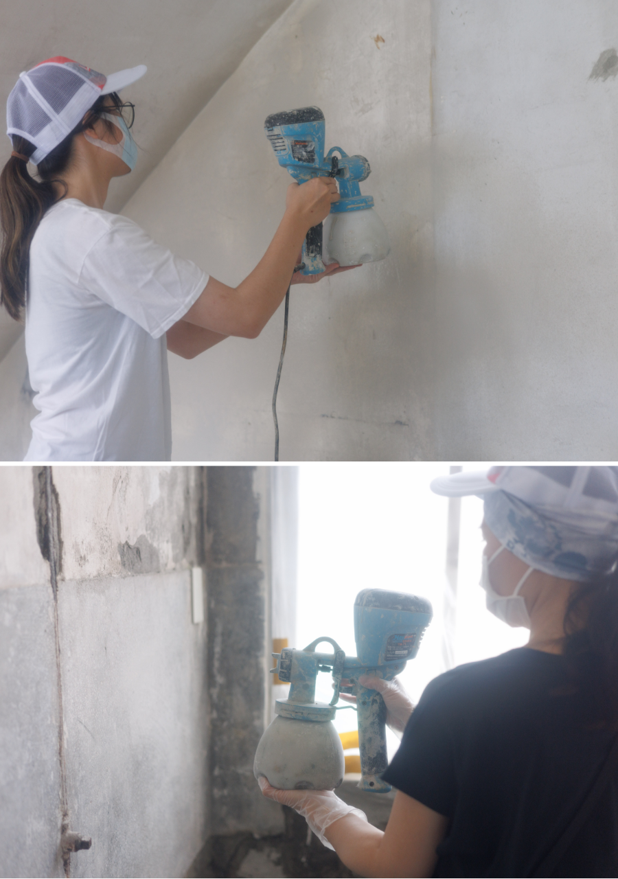 「樂土」團隊這一回協助「Aula」的部分整修,是在內牆與天花板做防潮以及粉刷。以下是本次工序,可使用抹鏝工具,也能改用較易上手的噴槍或滾軸,只要遵照樂土防水粉與水泥砂漿的正確比例來調配,讓「樂土灰泥」濃度適中、易於噴刷,目的是倚賴樂土的透氣性為老屋的內牆上一層淡妝。