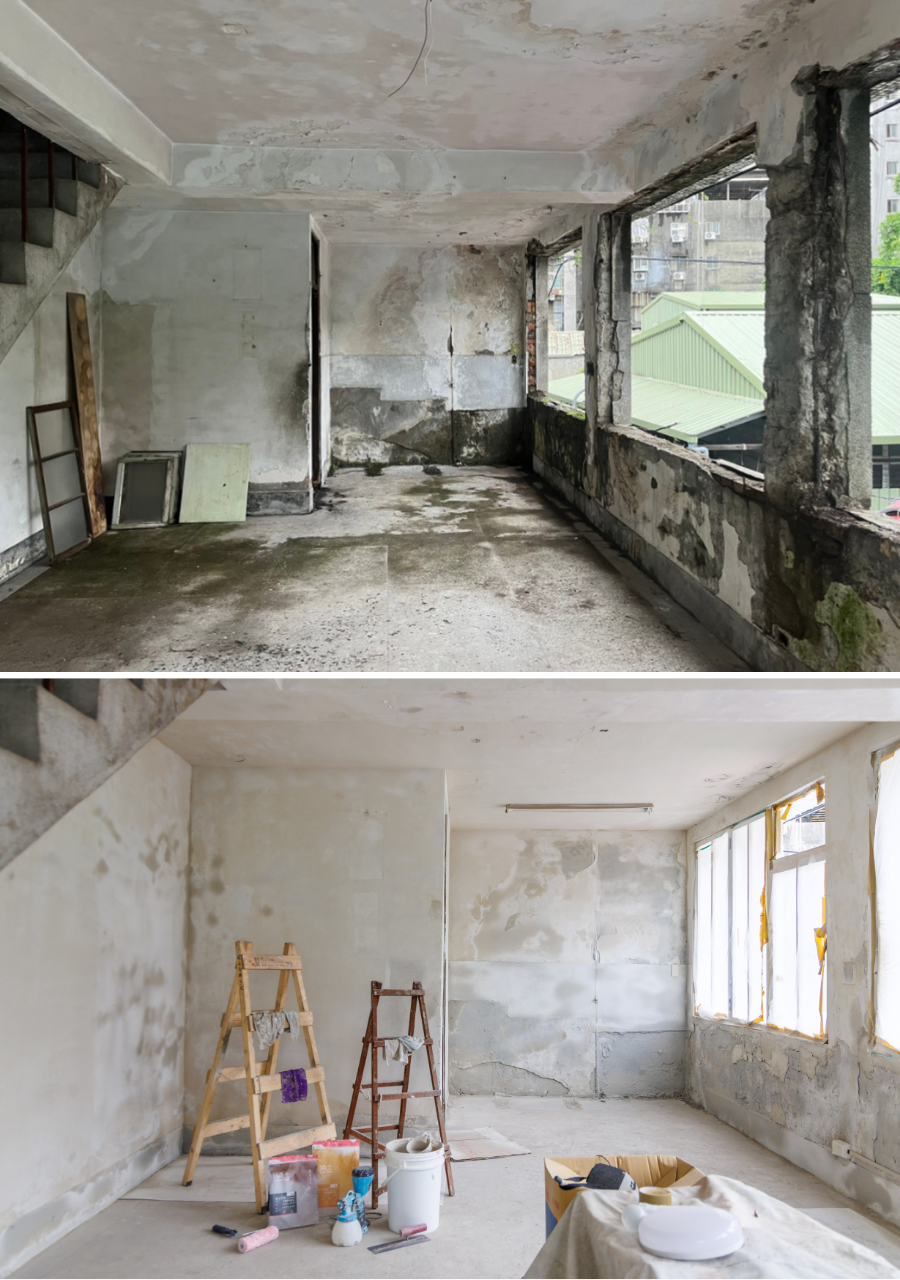 然而,讓老屋恢復呼吸並不容易。這棟樓雖經結構安全評估堪用,但壁癌、漏水與植物根系鑽進樓板和二樓外牆的老樹,都讓工程難度大增。徐瑞希笑說:「榕樹根系,光是處理它就花掉我們原本預算的一大半。」