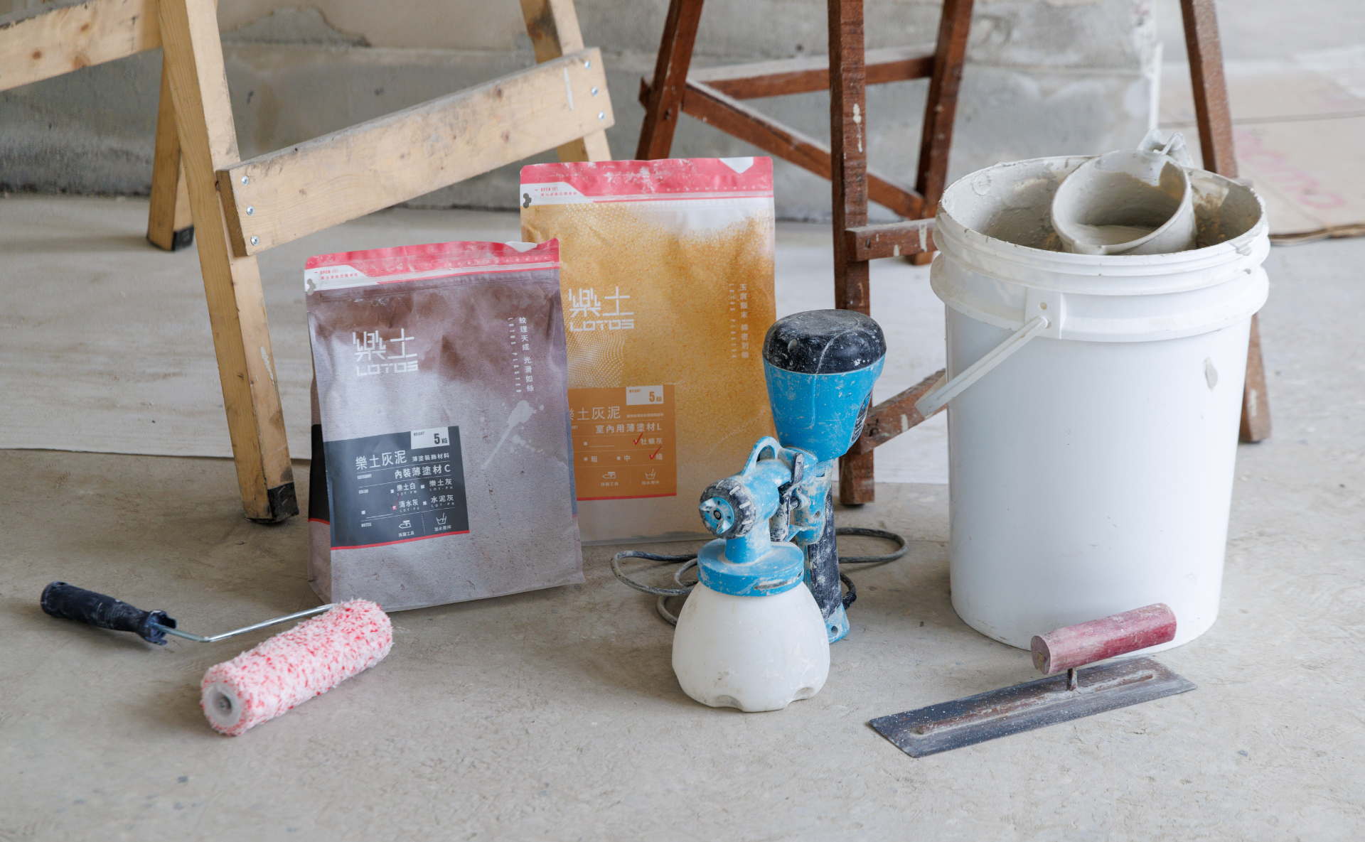 使用噴槍上第一層「樂土灰泥」,只需薄薄的一層,最多約0.25cm。一樓使用「樂土灰泥」絲綢型的清水灰色,其成分包含以台灣水庫淤泥改質而成的斥水性粉體以及水泥或樹脂等黏著劑。此配方可創造出細緻的絲綢般紋理,表面光滑,摸起來觸感柔順。
