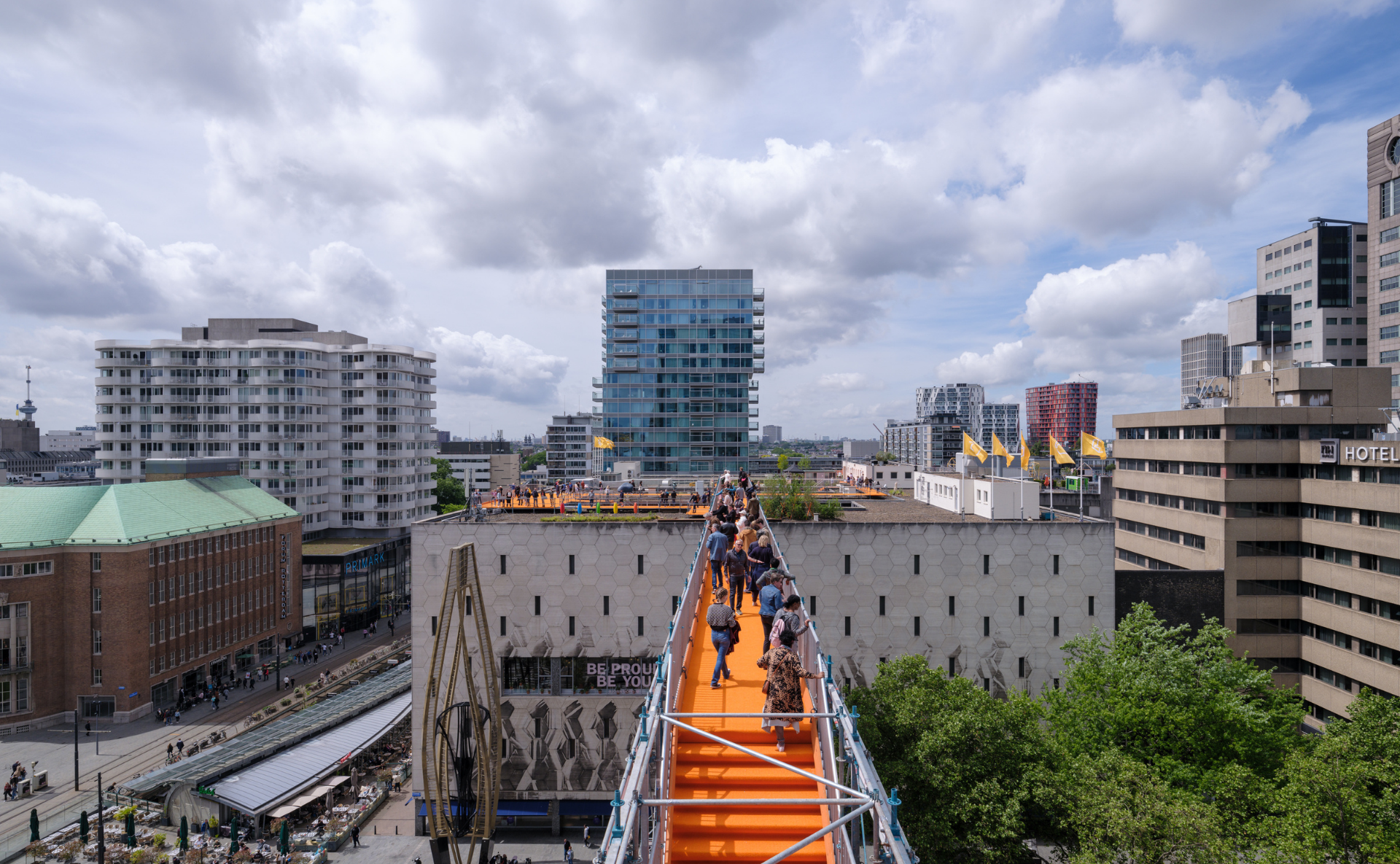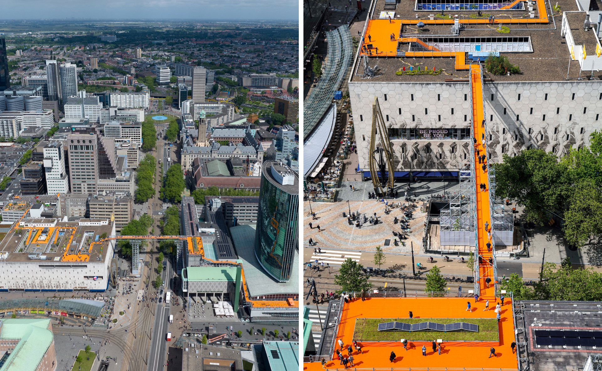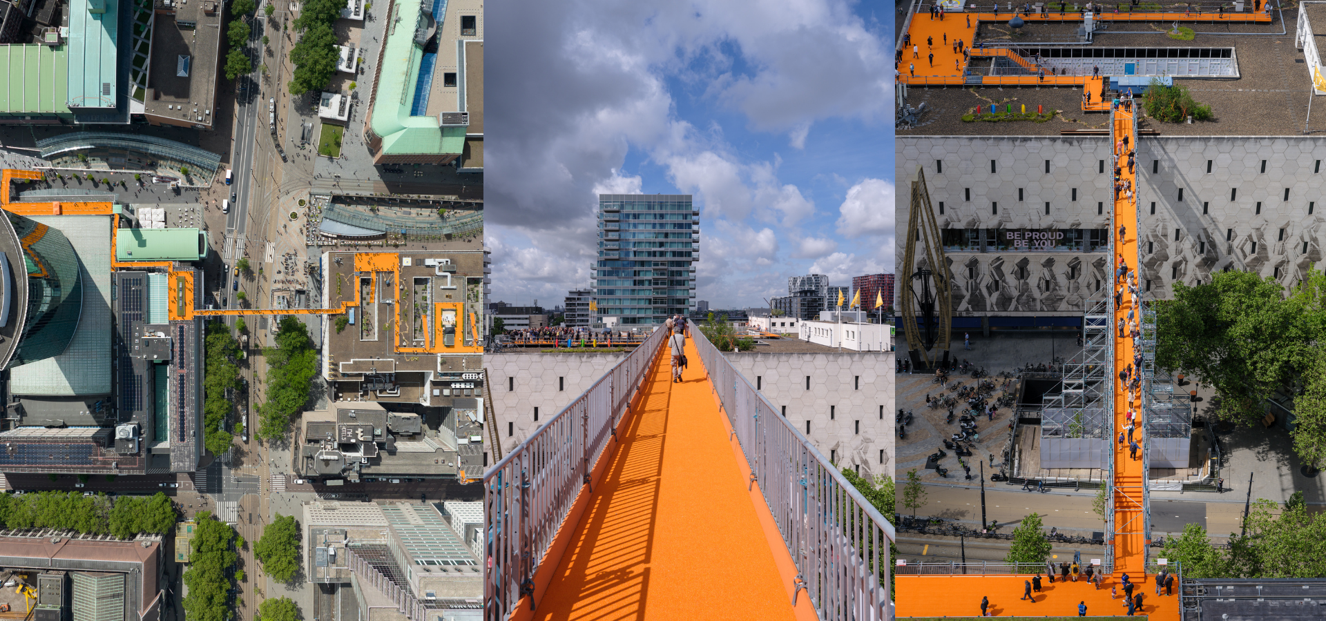 而後2022年屋頂節,MVRDV再設計另一作品:鹿特丹屋頂步道「Rotterdam Rooftop Walk」,當一條600公尺長的亮橘色地毯鋪上鹿特丹的天際線,串聯了兩棟地標建築:鹿特丹世貿中心(WTC Rotterdam)的基座屋頂與知名的女王百貨(De Bijenkorf)屋頂,並跨越了一條主要幹道酷爾辛格大街(Coolsingel),讓行人能在30公尺的高空中穿越這條平時車水馬龍的主幹道。