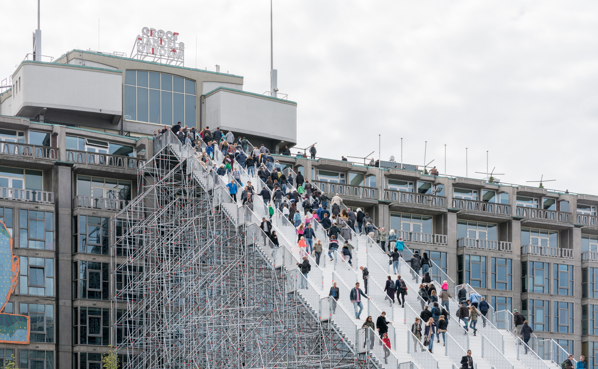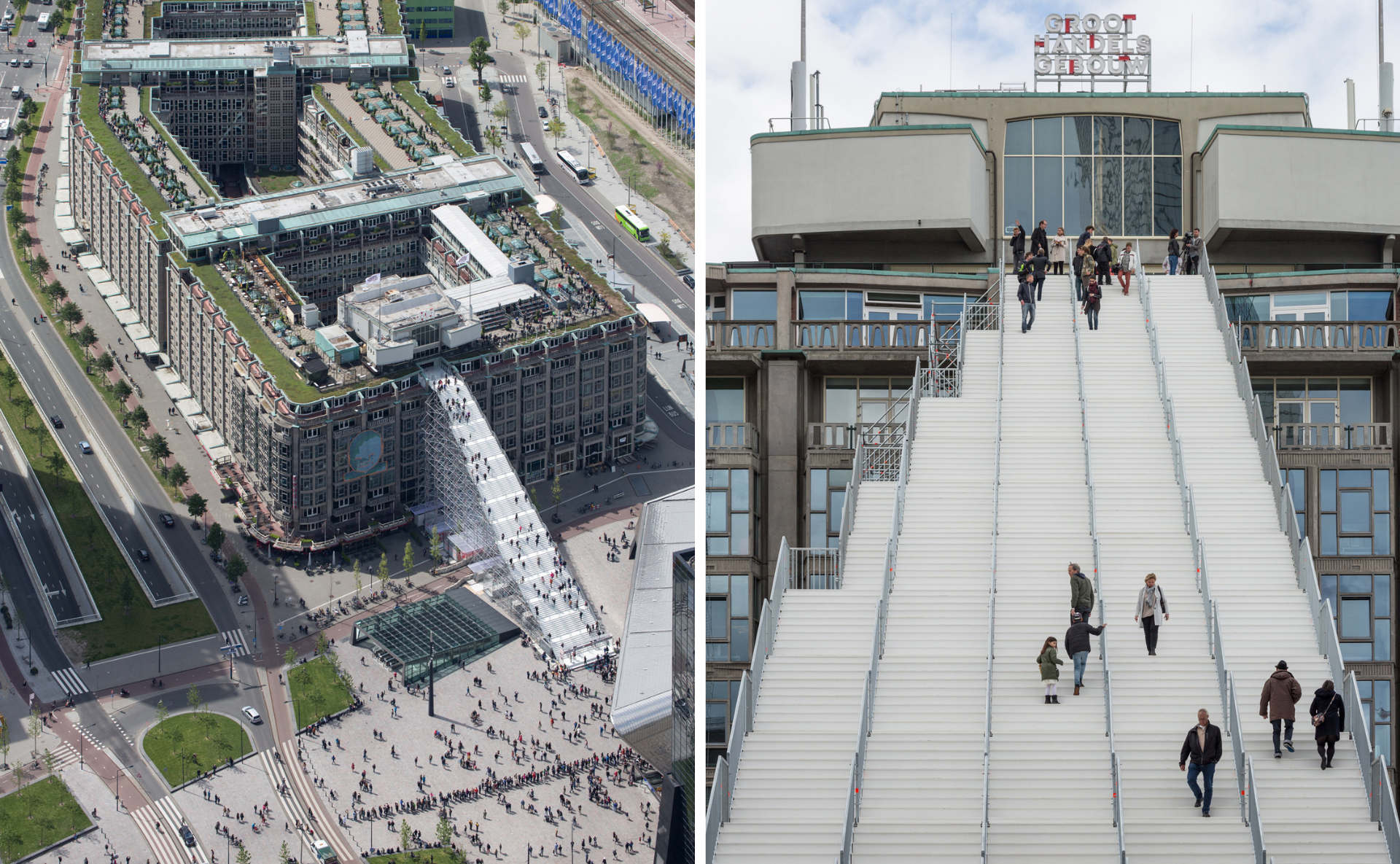 鹿特丹屋頂節(Rotterdam Rooftop Days)的起源與建築團隊MVRDV息息相關,MVRDV是來自荷蘭鹿特丹勇於挑戰常規、將數據轉化為前衛建築的設計團隊,他們與鹿特丹屋頂節的結緣可以追溯到2016年,當時為了慶祝鹿特丹戰後重建75週年,MVRDV設計了一個臨時裝置「Stairs to Kriterion」作品,用鷹架搭建了非常巨大的白色階梯,並直通大型建築鹿特丹批發大樓(Groothandelsgebouw)的屋頂。