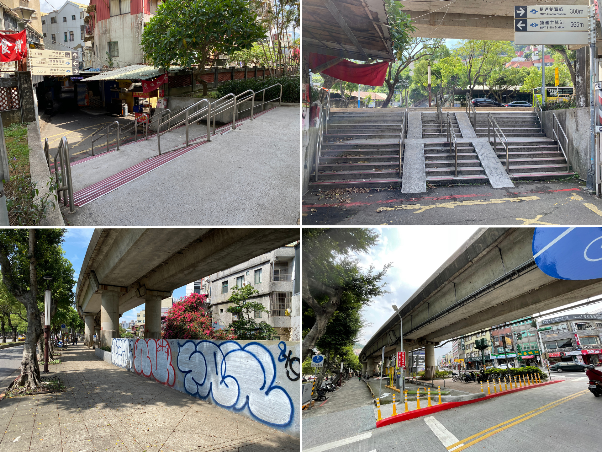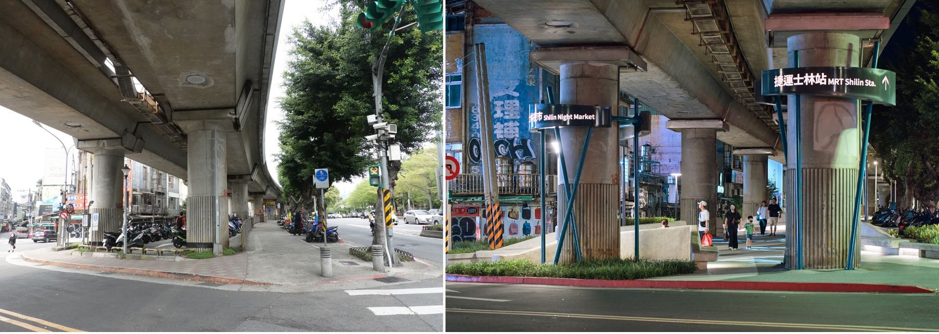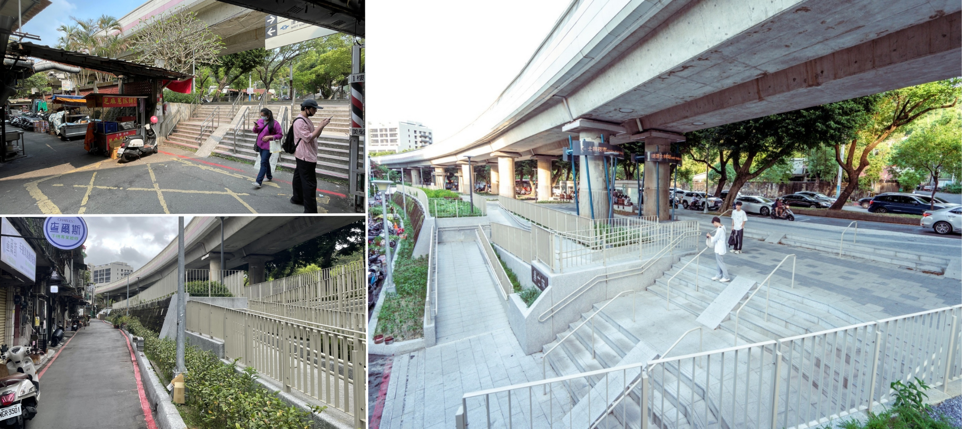 改造後的捷運橋下空間,將原本斷斷續續、被花台或高低差阻隔的路徑接起來,創造出從士林站到劍潭站連續的步行空間。