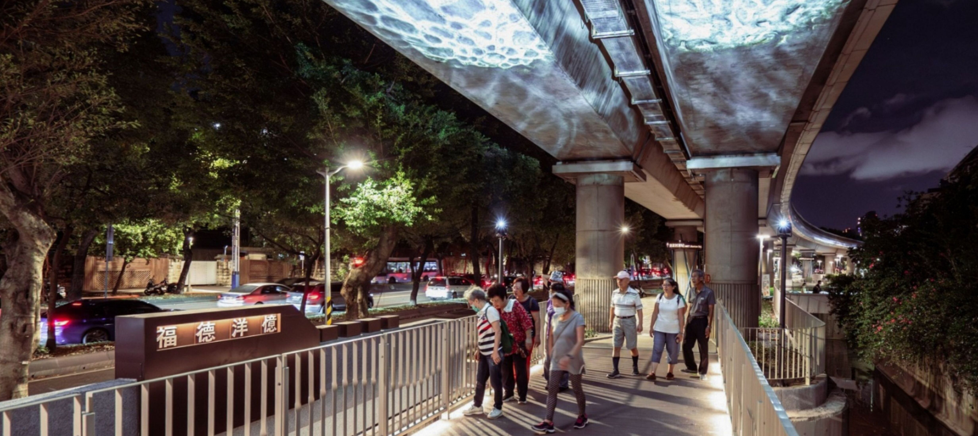 「我們在現勘的時候發現,正中午大概11點到12點之間,太陽照射水面會投影到橋下,產生粼粼的水波紋光影。」這個自然的瞬間給了她靈感。為了讓晚上也能延續這份記憶,境觀設計了特殊的投影燈,將水波紋的光影投射在橋下的結構與地面上。「如果晚上也讓它有這個水波紋的呈現,可以更加深大家對於這個水紋的記憶。」這是一種跨越景觀與藝術的嘗試,不使用具象的船隻或水車造型,而是用光影來訴說水的故事。